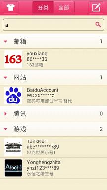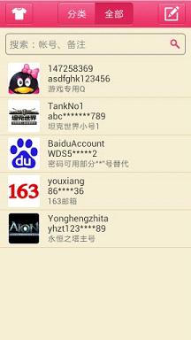 三、功能强大。可切换分类/全部来查看;提供搜索帐号信息功能;帐号图片可以选择拍照或从本地添加。