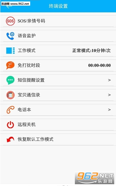 10、设置:APP可以设置SOS/亲情号码,设备工作模式,监护号码, 免打扰模式等。