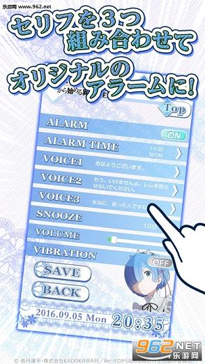 TV动画《从零开始的异世界生活》改编自日本著名轻小说作家长月达平原作的同名轻小说,由于较为离奇的剧情和悲催的主角受到不少二次元宅的关注,目前该番依然在国内网站当中连载,除了剧情之外,该作当中两大女主角雷姆与爱蜜莉雅也受到不少关注,有鉴于其较高的人气,近日日本厂商推出了一款主题闹钟APP,支持iOS/Android,目前已经在两大市场当中上架。
