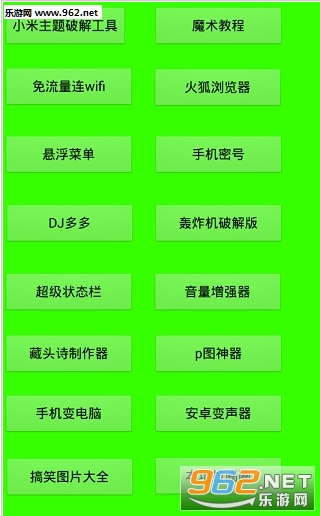 秒赞、天气查询、手机号归属地查询、刷钻教程、通知栏美化、百度网盘解析、移动卡一键查询流量、反编译、拉圈圈、手机搭建网站、SID获取、网页源码提取器、特殊网名制作、QQ无限拉圈圈、qq空间手机标识、QQ空间小尾巴、QQ空间蓝色字体生成器、QQ刷屏、QQ空间刷留言、自定义说说尾巴、竖网名生成器、蓝色尾巴生成器、iapp伪加密功能、iapp源码加密功能、2048游戏、小游戏一堆、sid提取器、QQ空间发说说、歌曲搜歌词、post参数提取、qq空间刷人气、网名生成器、照片墙分割、名片赞背景提取器、标签赞、免流等。