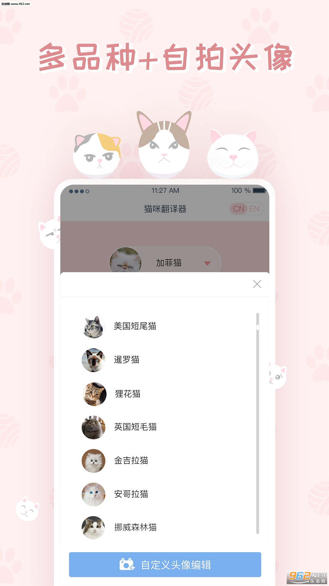 支持所有猫咪品种的语言翻译,并有多种类型声音可供挑选,比如:波斯猫、布偶猫、狸花猫、美国短毛猫、英国短毛猫、金吉拉猫、安哥拉猫、挪威森林猫等。