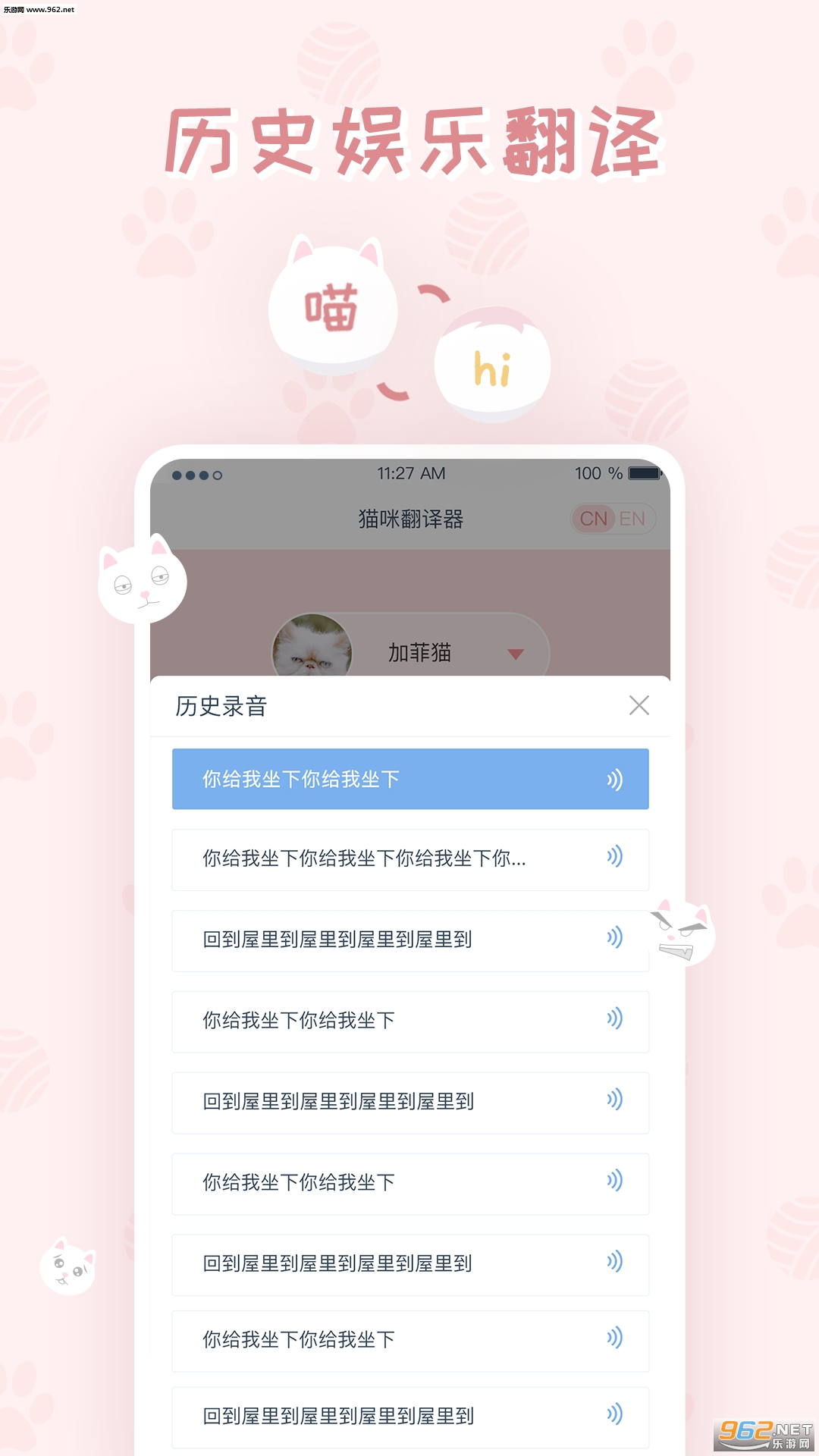 猫咪翻译器是一款非常好玩的人猫情感交流器,可将人类语言实时模拟翻译成为猫猫的语言,让猫咪听得懂人类的语言,从而拉近与主人间的关系,实现零距离互动交流。