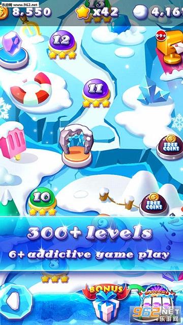 《粉碎冰块 Ice Crush最新安卓版》是一款Ezjoy公司创作的休闲娱乐消消乐游戏,游戏背景冰雪包围,可选择雪人来改变和提升技能,从而得到更高的分数。