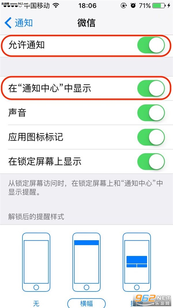 之后,将下面可选项中的“在‘通知中心’中显示”,也要点开!点开!点开!