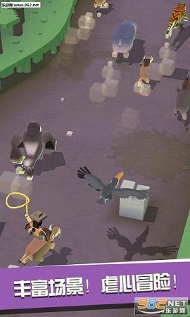 《疯狂动物园》是一款集3D像素、急速跑酷和模拟养成为一体的休闲小游戏。在游戏中你将扮演一名富有冒险精神的绝世牛仔。在高速移动的情况下与各种动物一较高下。你要尽可能多的套住动物,将它们统统带回飞船上的“空中动物园”中饲养;并进行园区升级,以便迎来世界各地的游客光临赚取更多金币,Now,让我们去好好大干一场吧!