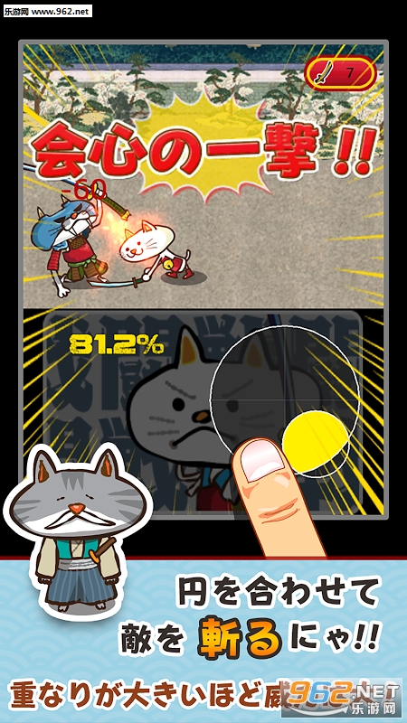 这是一款以武打为主的简单动作系时代剧RPG,游戏中包括主角和敌军怪物的一众角色形象,全部由猫咪化身而来。它们的造型大部分比较可爱,也有一些是带着点恐怖感觉的诡异萌。游戏操作基本全程通过点击完成,比较有趣的是战斗方式。进入战斗之后画面上会出现一大一小两个圆圈,点按小圆圈可让它在大圆周围运动,松手则可以发动攻击。攻击时两个圆圈重合的黄色部分面积越大,对怪物造成的伤害也就越多。