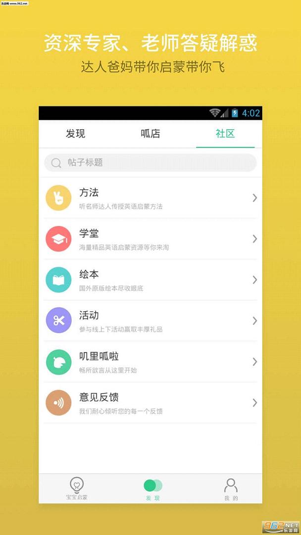 社区:想听名师达人的英语启蒙方法?想看达人妈妈分享启蒙心得和干货?想参与线上线下的活动?快来社区吧!