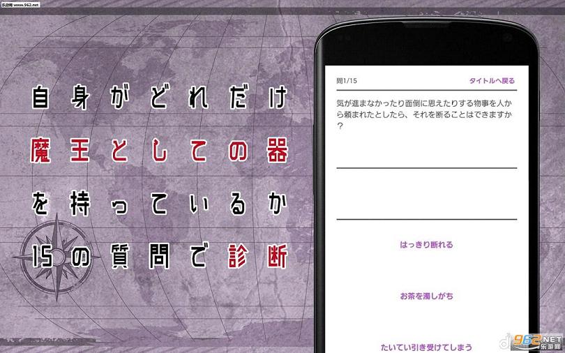 游戏中只要按顺序回答15道问题后即可看到自己是个什么样的魔王了。系统给出的结果,除了一大段普通的文字说明之外,还有非常直观的一个“LV”显示。该LV并不是只你自身的等级,而是说想要干掉你,勇者需要的等级。