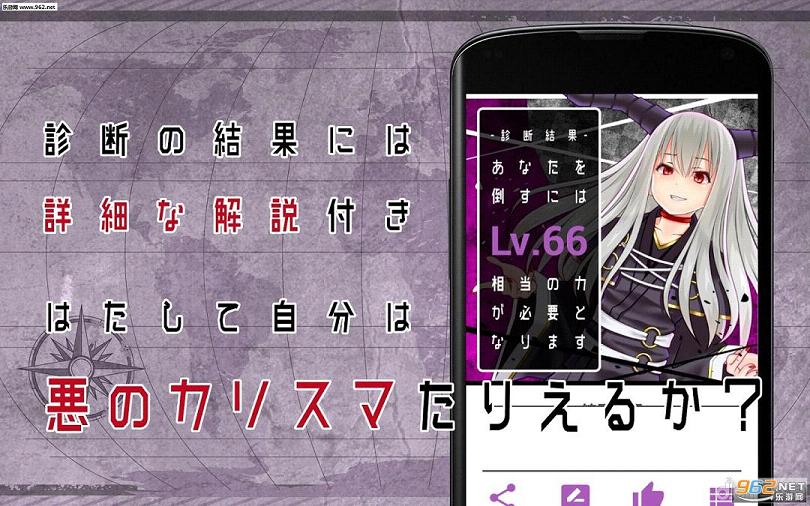 简单有趣的问答,让你看看自己是否有成为魔王的潜质,超多有趣的内容等你来体验!比起大段的文字说明,这个LV显示可以更直观的显示出你的实力范围。是最终boss还是杂鱼boss一目了然。