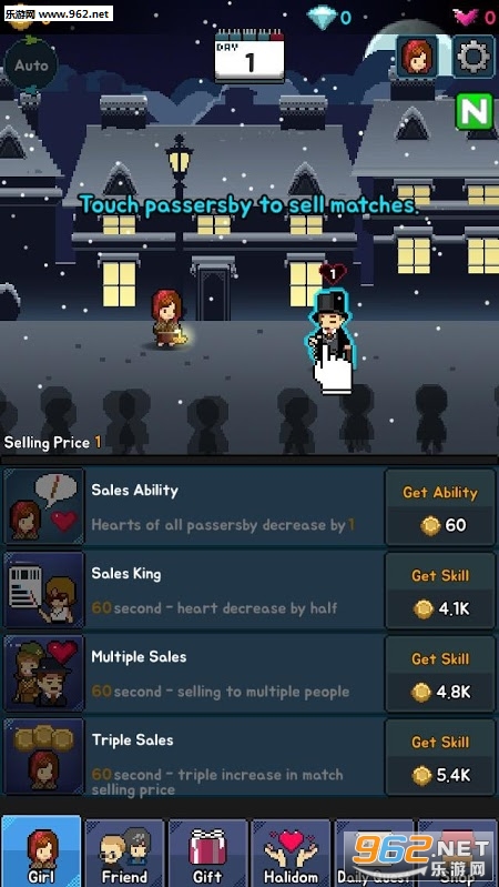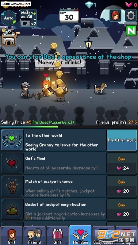 游戏中除了卖火柴增加自己的金钱之外,还可能通过伙伴赠送的礼物和衣服来强化自己卖火柴的能力,在卖火柴的时候喝醉的老爸还会出现强行征收小女孩的钱,玩家还需要制定对策来躲避父亲的强抢等等……可以游玩的要素意外地多,对本作感兴趣的玩家们不要错过!