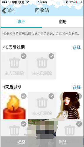 如下图:勾选你想要恢复的照片,点选【还原】,之后进入QQ空间相册就能看到被还原的照片了。