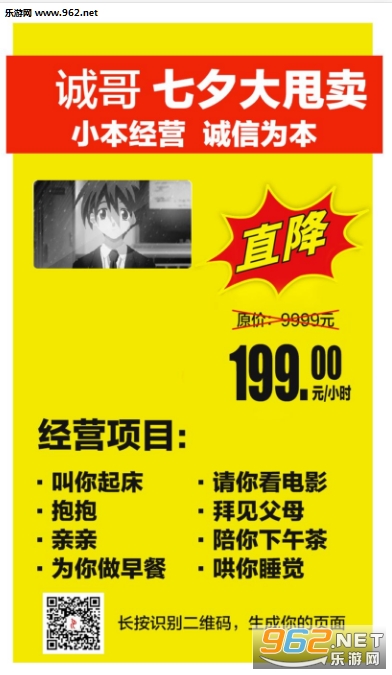 七夕大甩卖在线PS图片制作软件是一款制作一张租人图片的软件,最新很多人被朋友圈的七夕出租自己的图片给刷屏了,而且每一个的服务项目与价格都不一样,其实这些图片都是通过这款生成器制作的。大家如果想在七夕出租自己可以来西西下载这款生成器,在线制作一张图片。