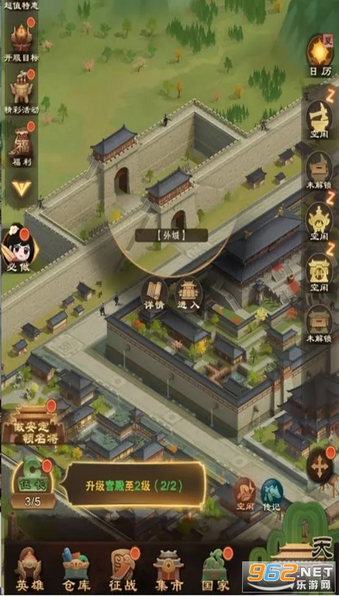 我们优先给主将升级兵种和练兵,兵种的最高等级跟随宫殿等级,所需资源由东征西讨产出(60级后由科技提升。)