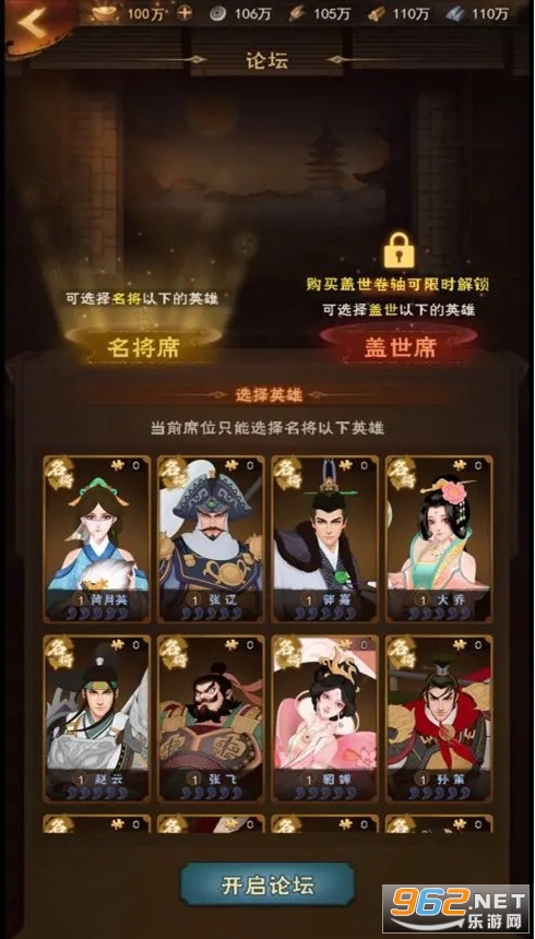 论坛有两个席位,分别可以派遣名将和盖世英雄;