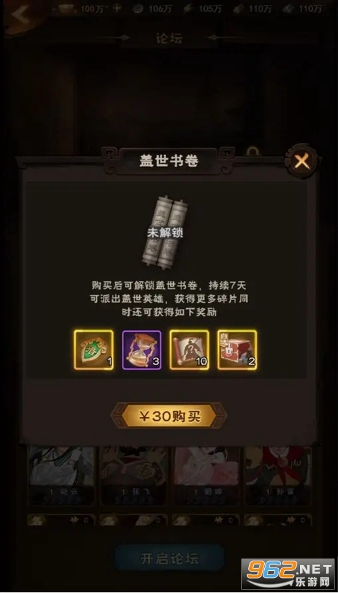 其中盖世英雄席位需要购买激活盖世书卷,每次激活持续7天。