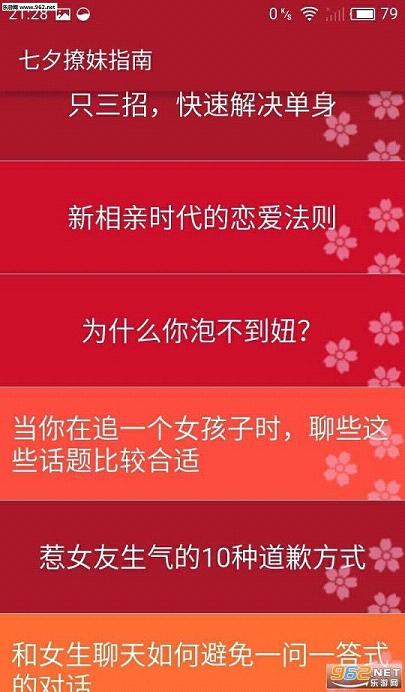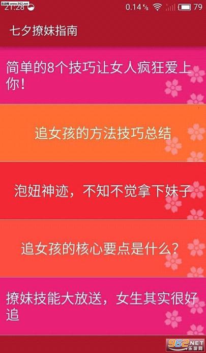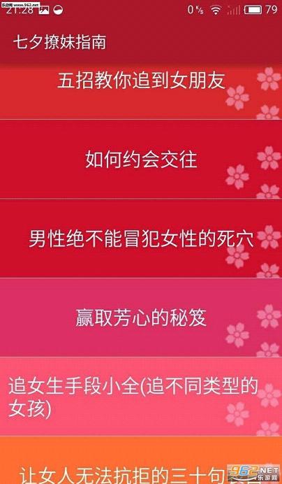 七夕撩妹指南app是一款单身狗必备手机宝典,这里有海量撩妹招数传授给你,帮你分析女神心态,超多表白高招让你无往不利,趁着七夕快到了,大胆表白吧!