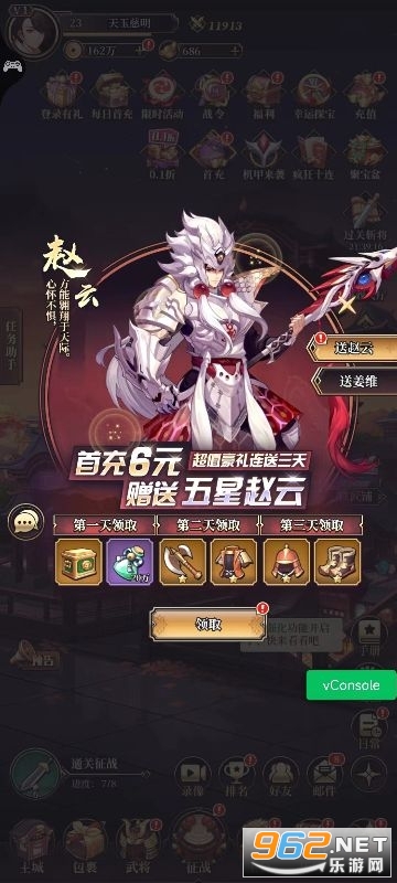 《远征将士》是一款二次元风格的放置卡牌手游,游戏加入了众多Q版的三国英雄卡牌,玩家可以收集各种三国英雄来组成自己的队伍,合理的搭配站位,带领队伍前往一个个副本去战斗,采用的回合制战斗玩法,解放双手,轻松战斗。在这个版本中,玩家可以享受到0.1折的超值福利,让你在游戏中更轻松地招募伙伴,开疆拓土,成就乱世霸业。