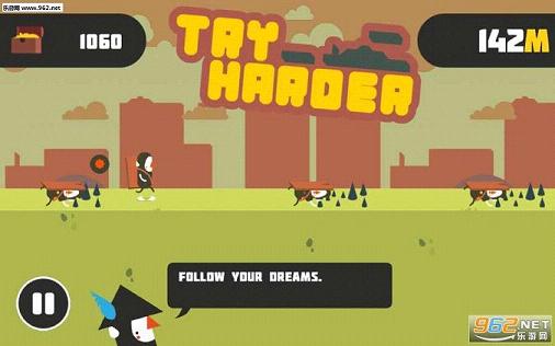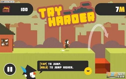 《奋勇向前》是由开发商adult swim推出的一款休闲跑酷小游戏。《奋勇向前Try Harder》以插画风格展示游戏,整个画面带有有童话色彩的味道。游戏中玩家要控制主人公,通过点击跳跃,越过障碍、陷阱,奋勇前进奔跑即可。