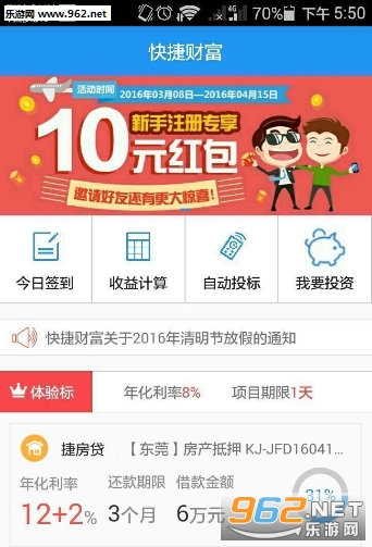 2、完整移植了快捷财富在PC端的所有核心功能,让您在手机上就可完成从注册、登录、充值、投标到等全闭环的流程,轻松一点,随手财就来。