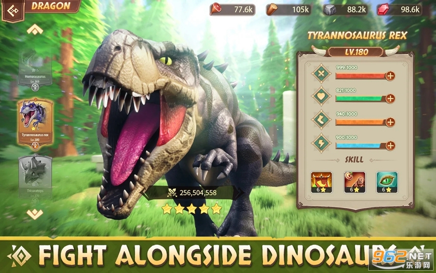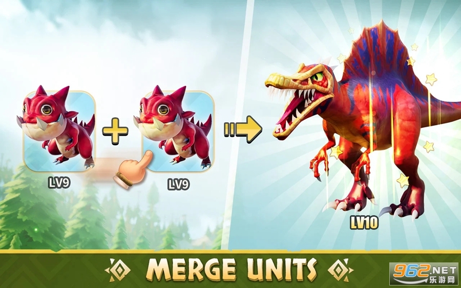 你可以捕捉并驯服各种各样的恐龙,与你的部队并肩作战。升级您的恐龙以变得更强大,并以其不可阻挡的力量称霸战场