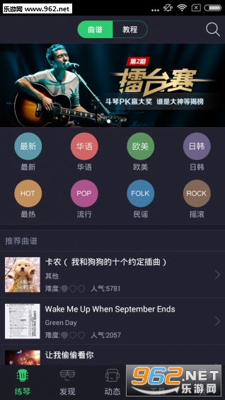 游戏化的吉他谱界面,只需拿起您真正的吉他,然后像玩游戏一样声琴并茂,不用识谱就能快速上手,内置节拍器,跟着流动的音符high起来,更是您培养节奏感的有效练琴方式。通过全球领先的乐音识别技术,实时对您的吉他弹奏进行诊断和智能评分,还可以实时看到您在好友圈的得分排名,您也可以和琴友一起在线挑战同一首歌,斗琴切磋!