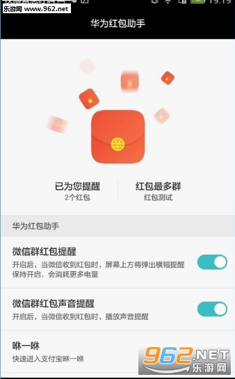 1、华为红包助手是您抢红包的神器。支持红包横幅提醒,声音提醒,提醒数量和群统计等功能,并提供支付宝咻一咻和摇一摇的快捷入口。