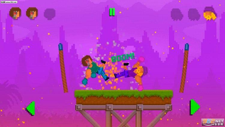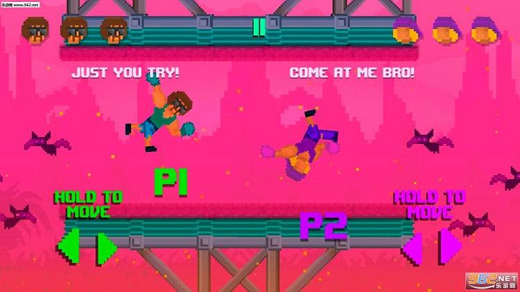 在刚进入游戏之后,游戏就放弃了主界面直接让玩家选择是一人游戏还是二人游戏,玩家在做出了选择之后就会直接进入到游戏中开始游戏体验。本作采用了复古的像素风格设计,这在许多同类型的游戏中还是比较常见的,不过正是这样的画面设计让游戏的趣味性得到了一定的提升。在游戏中玩家将与对手共处在一个平台之上,而在平台下方则是滚滚岩浆,在游戏中玩家所要做的就是想尽办法将敌人扔到岩浆里,谁能最终留在平台上,谁才能笑到最后,不过这可比看上去难上不少。
