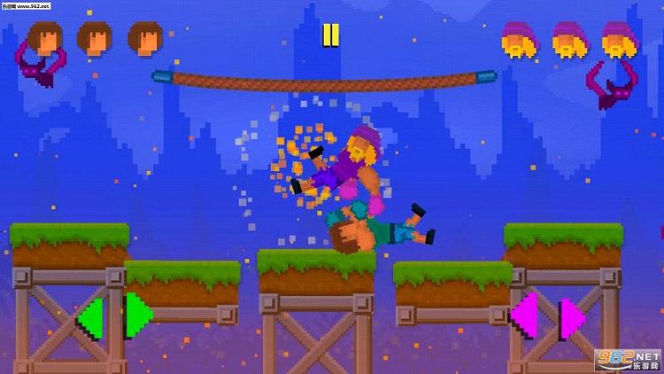 游戏中的操作方式非常简单,在画面两侧分别设置了左右两个方向键,玩家通过按住按键即可控制角色往左边移动还是右边移动,如果玩家长时间按着一个方向的话,角色就会不停的转圈圈,不过如果两个角色接触到之后就会抓住对方,然后往相应的方向甩出去。而在场景中也会出现一些道具,玩家可以利用这些道具让自己免于被对方甩下平台,不过相应的对方也会利用这些道具,所以要想在游戏中获胜除了需要技术,有时候还是需要一点点的运气的。