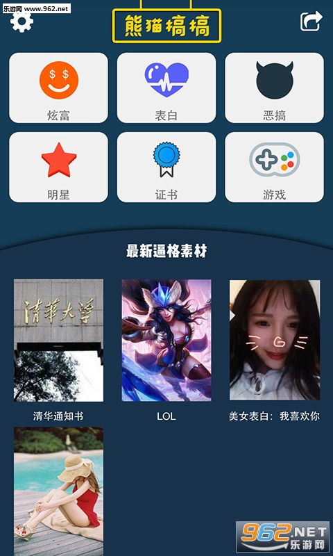 《熊猫搞搞app》是一款恶搞主题的手机应用,各种朋友圈炫富方式,在这里都可以找到,还有花样表白,恶搞好友,和明星的合照,各种毫无PS的证件等,各种装逼方式,只有你想不到的,没有不能带你玩的哦。