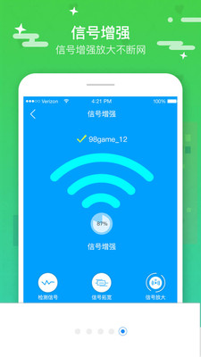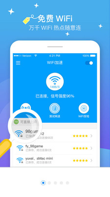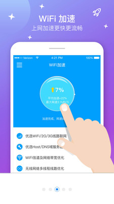 WiFi上网加速器通过有效增强WiFI信号、提升WIFI硬件性能、释放WiFi缓存空间、拓展WIFI网络带宽、节省WiFi电池消耗、快速连接WiFI热点、智能获取WiFi密码、优选DNS配置、清理APP后台网络占用等各种核心因素,是手机上网必备的WiFi工具之一!