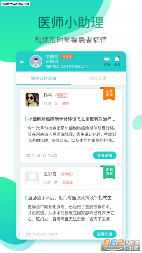 《慧济医生app》是一款健康医疗应用,用户可以通过软件获取专业的肿瘤医疗资讯,了解癌症医疗技术与药物治疗,为用户抗癌提供帮助。有需要的朋友就快来乐游网下载吧!