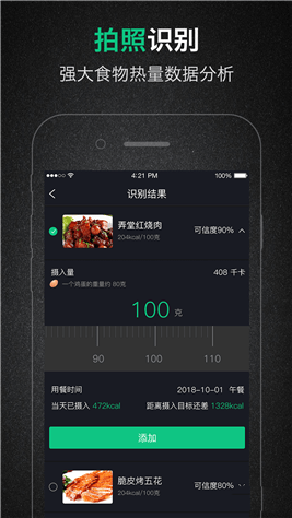 “卡路里”频道,可以一键拍摄识别食物,分享和统计管理每餐、每天、每周和每月的饮食情况。