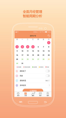 【女性健康管理】:监测基础体温,分析月经周期,提示月经到来;支持记录宫颈粘液、异常信息、体重等,智能分析女性健康状况。