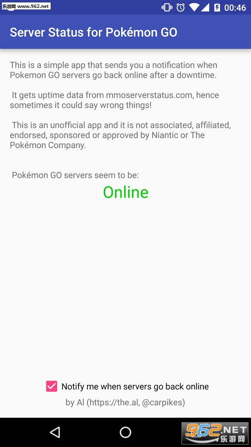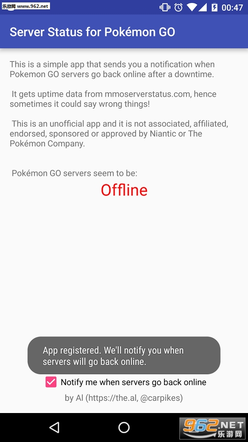 这个应用将会在Pokemon GO服务器崩溃后重新上线的情况下发送通知给你。