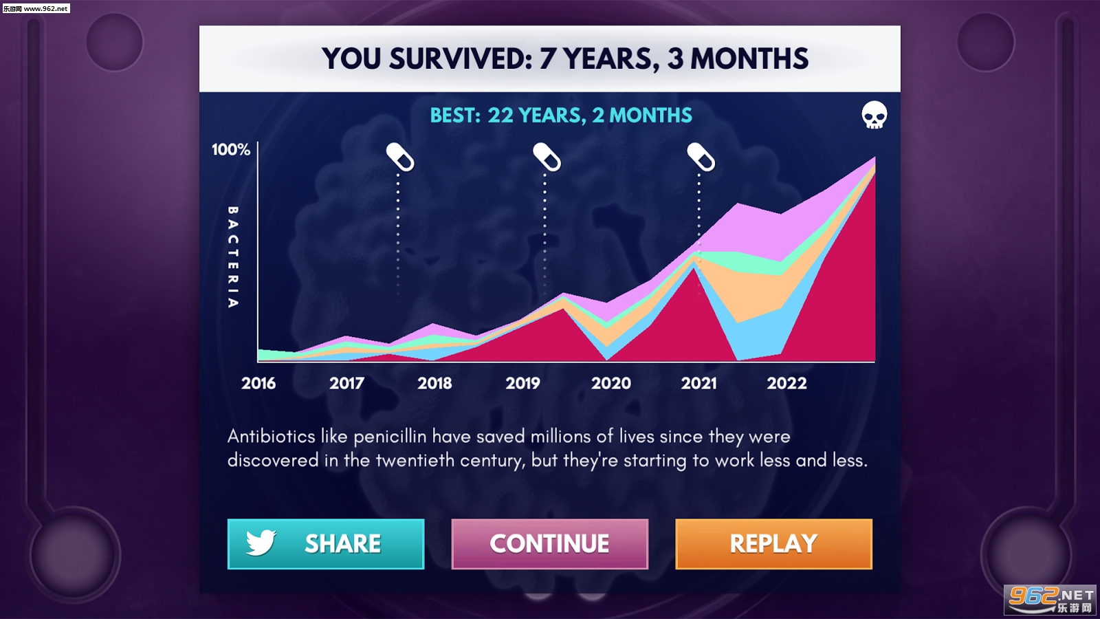 这款游戏客观地反映了我们现在的医疗模式:使用抗生素对抗细菌,刚开始我们能使用抗生素迅速的消灭细菌,但随着时间的流逝,细菌们有了抗体,抗生素便无、不再那么有效,而我们这时该如何才能生存的更久呢?
