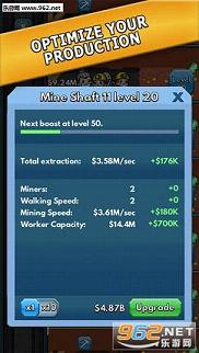 游戏中玩家还要升级各种挖掘设备,挖到更多的金币,最后成为业界第一的矿业大亨。即使是不玩游戏的时候,供人们也会进行挖掘工作,让玩家在不知不觉中赚取大量金币。