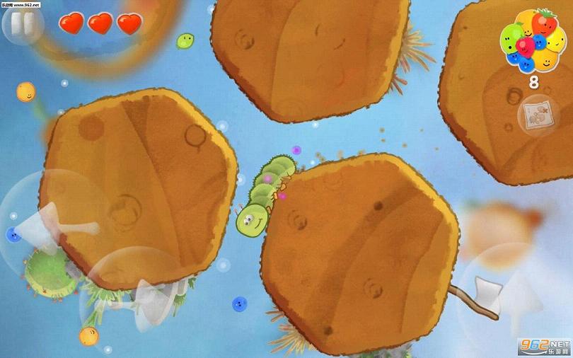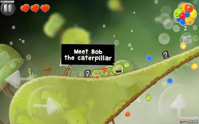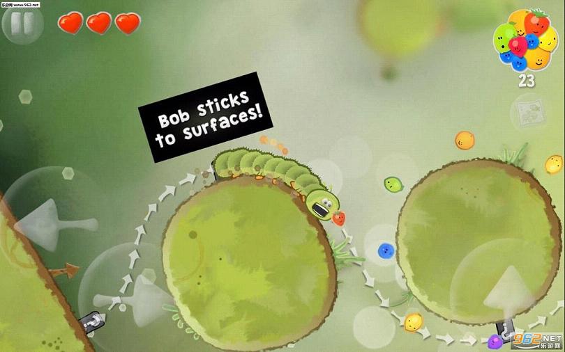 从游戏的玩法来看,相当的简单易懂。在游戏中玩家要控制一只名为Bob的毛毛虫,它可以吃下沿途的水果获得过关的路线,以及利用它那可以无视重力的脚来依附到其他区域,从而顺利到达关卡的终点。