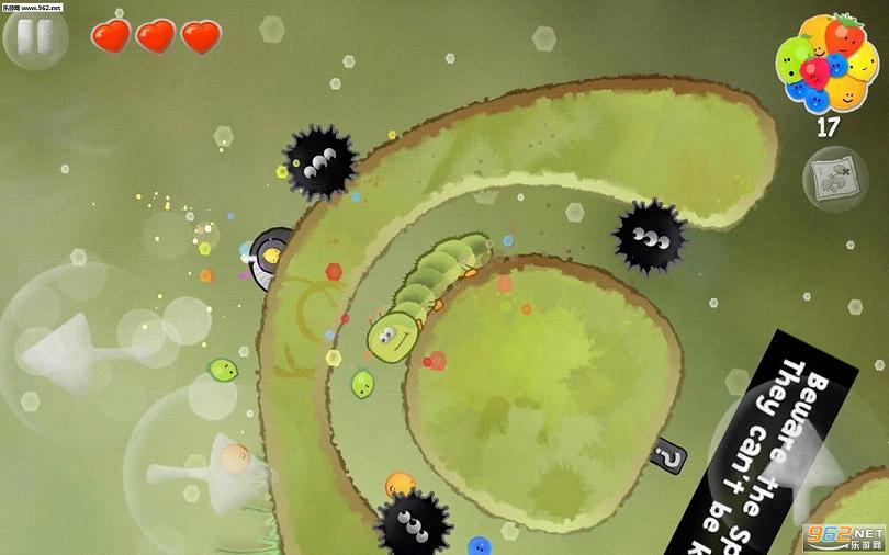 同时这只毛毛虫也有类似贪吃蛇的成长特性,值得注意的是,Bob每吃掉一颗水果,自己的体型都会长大一点,这就意味着庞大的它将更容易成为恶虫攻击的对象。而加长的身体会变得更容易受到敌人的攻击,所以对付敌人的时候要变得格外小心。