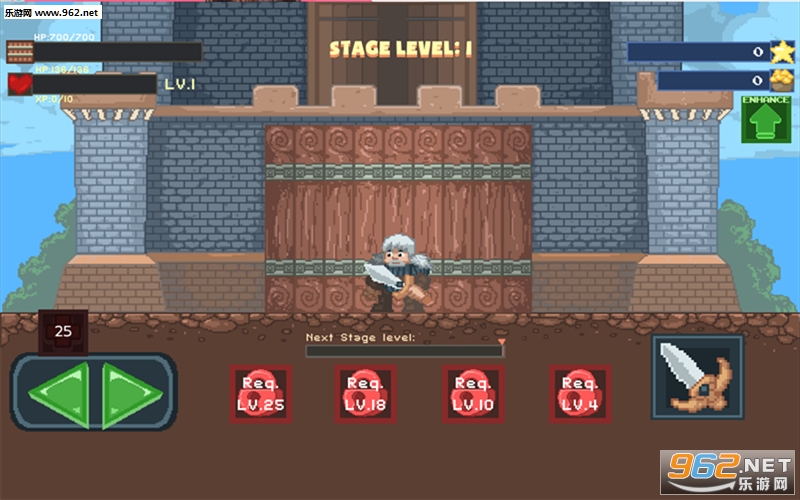 基本玩法就是在大门的左右两边会不断刷新出异鬼大军,而玩家需控制英雄左右移动,杀死敌人。游戏有着许多RPG元素,诸如在消灭敌人后可获得经验提升角色的攻击力、生命值等属性,以及可提升玩家的技能的天赋点。利用杀敌后的奖励金币,也可进行升级武器装备,帮助对付后续更强大的敌人。