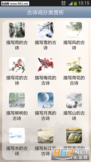 《古诗词分类赏析app》是专为古诗学习打造的应用,能随时查看各种古诗作品,按题材对古诗进行分了,更拥有古诗的鉴赏,是您阅读古诗词的好帮手。