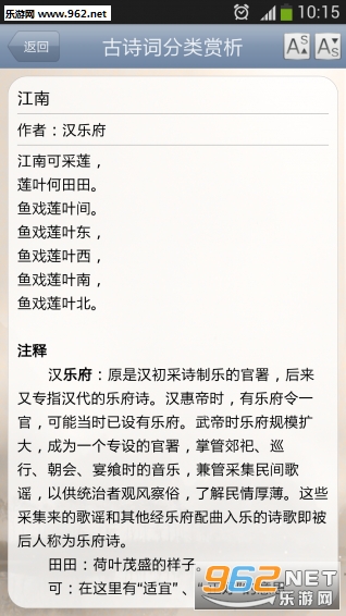 《古诗词分类赏析app最新版》是一款为小伙伴们打造的古诗词学习软件,软件中有着大量的古诗词赏析,而且进行了分类整理,如山水诗、描写雨的诗、描写雪的诗等,每首诗都有着详细的讲解。