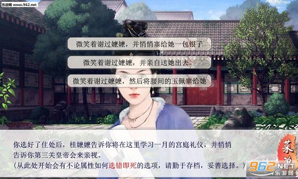 当然游戏有很多有意思的设定,有很多隐藏剧情,一旦某项好感值足够,就能进入隐藏剧情(说不定跟皇子或者妃嫔私奔哦)~~~游戏画风古典优美,首先记住存档,面对问题机智应对~~~后宫如职场,大胆的用自己的智慧征服这个游戏吧!