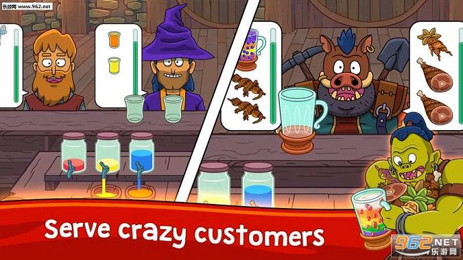 《药水大冲击》中由于白胡子的爷爷调制出让自己变小的药水,所以便让玩家所扮演的少年来经营自己药水商店。在这家店铺中,玩家需要为各式各样的人种来配药水。随着游戏的进行,药水也会出现混合型药水,并且顾客还会要求吃其他食物。总之,喜欢经营类和对自己手速有信心的玩家不要错过哦。