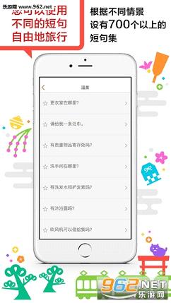 软件内建约700项观光、购物等日本旅行时常用短语。根据不同场景进行分类,查找起来很方便。可在周围嘈杂、不易辨识语音的场所使用,或在交谈前做准备。