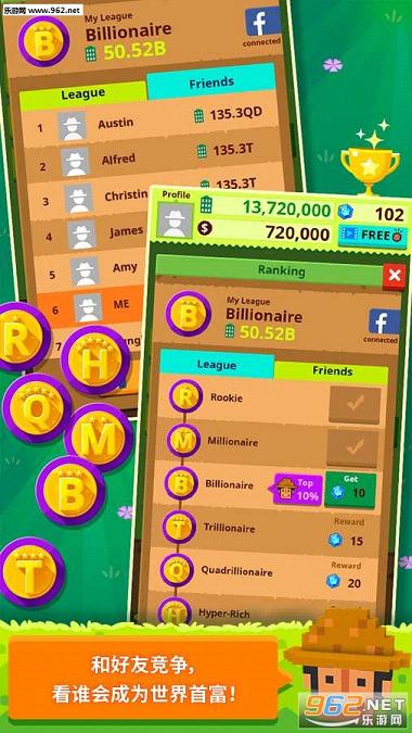 您是百万富翁了吗?还是亿万富翁?如果您的资产稳步提高,您在社团中的排名也会提升,同时收到丰厚的奖励。您觉得自己会成为世界首富吗?和好友一同竞争,锻炼自己的商业意识吧。