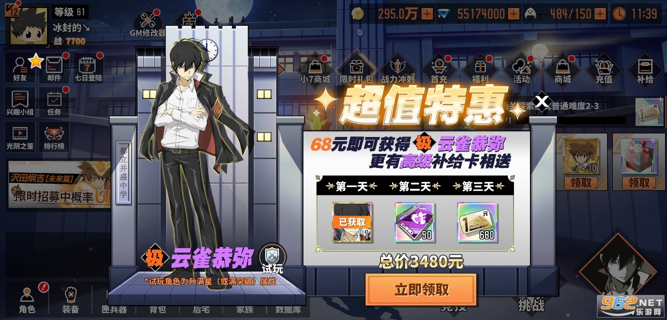 ★创角即送:角色[XANXUS]、金币*1880000、一元真充卡*648、补给卡*100