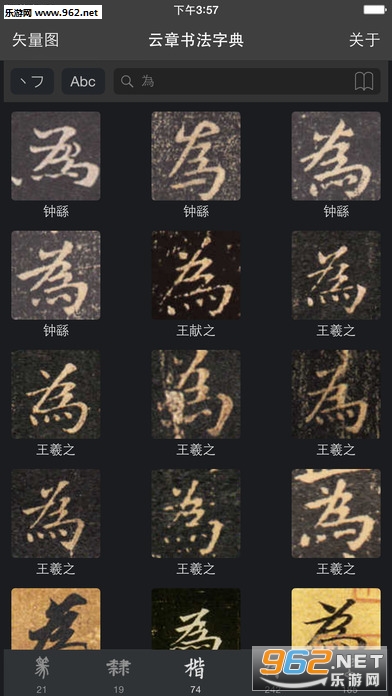 使用矢量格式存储字体图像,在iPhone、iPad上放大至三倍屏幕大小仍然有极高的质量而不失真,为目前市面上显示质量最高的在线书法字典;