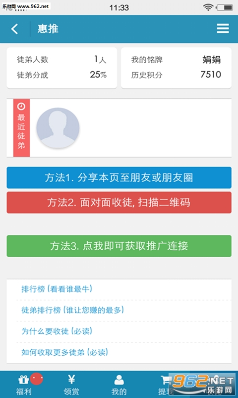 4、注册好后点击首页的“收徒”然后通过选择任一收徒方式进行收徒,当您的朋友注册好后就会成为您的徒弟,会及时奖励500积分,并且您还会享受徒弟收益的25%。