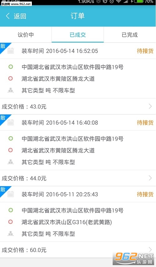 司机用户可轻松获得大量货源信息,根据自身位置及车辆状况进行议价抢单,抢单成功后,依据导航定位找到货物所在地,装载运输至目的地,货物确认签收,选择线上线下运费结算,提高司机收入。