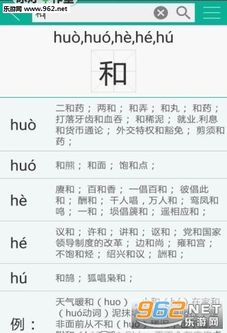 3、多音字查询:录入4000多多音字,不同发音词组,还有经典例句;